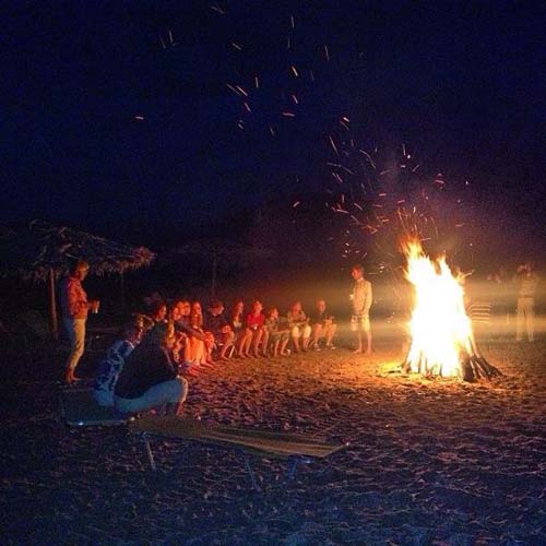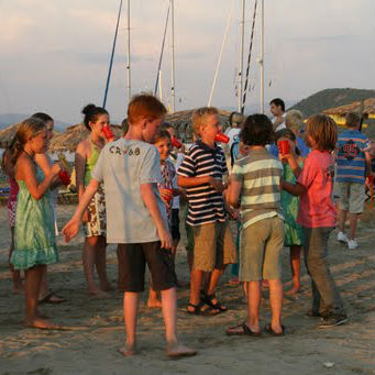 De oversteek van Paxos naar Parga is altijd een leuke tocht. Soms zien we dolfijnen en vaak hebben we halve wind, die in de middag lekker doorblaast. De haven van Parga is goed beschut voor noordwesten wind. Je ligt er een stukje van de stad af, afgemeerd aan het strand. En dat is altijd weer een happening voor de kinderen: pannenkoeken bakken! Bepakt met gasstelletjes en -flessen naar het strand. Iedereen maakt iets, bijvoorbeeld sla, fruitsalade, aardappelsalade, sardientjes schoonmaken en de kinderen maken het beslag. We zoeken ook stenen en hout voor de bbq (die later op de avond ons kampvuur wordt). En als het dan donker is, komen de kampliedjes en die ene vader met dat spannende spookverhaal...